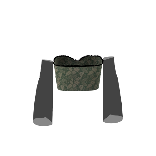The "Green Leaves" top is a digital piece that features a nature-inspired design with an earthy green leaf pattern. Its strapless corset-style fit exudes elegance, while detachable black sleeves add a modern, edgy flair. Perfect for versatile styling, this statement piece effortlessly blends sophistication with a hint of natural charm for any occasion.