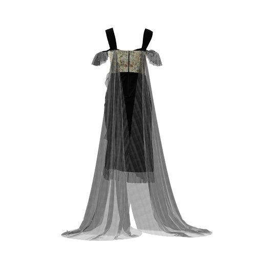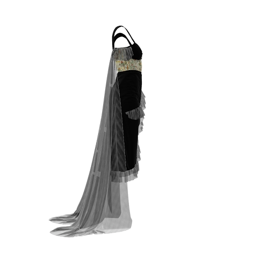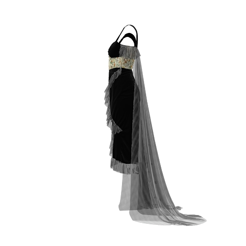 The Ethereal Cascade digital dress blends elegance and boldness with its structured black bodice, leafy green accents, and asymmetric sheer ruffles. Off-shoulder straps and flowing translucent trails add a touch of mystique. Perfect for evening events, this design exudes sophistication while making a captivating, nature-inspired statement.